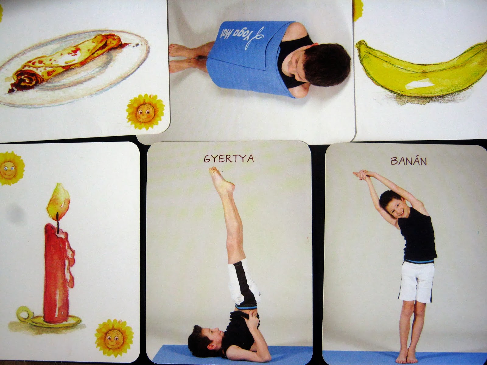 Máskor jógázunk a kártyákkal. Például kirakjuk őket lefelé fordítva, és memóriakártyaként párt keresünk (addig játszunk, amíg mindenki nem talál legalább egy párt), a párokból pedig sorozatokat állítunk össze, és együtt végigcsináljuk néhányszor.
