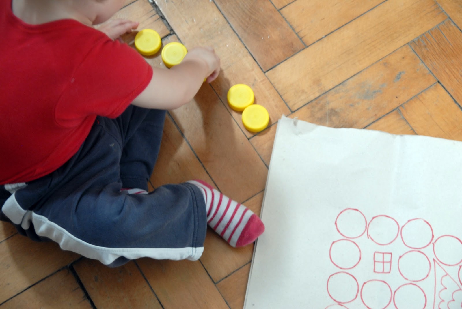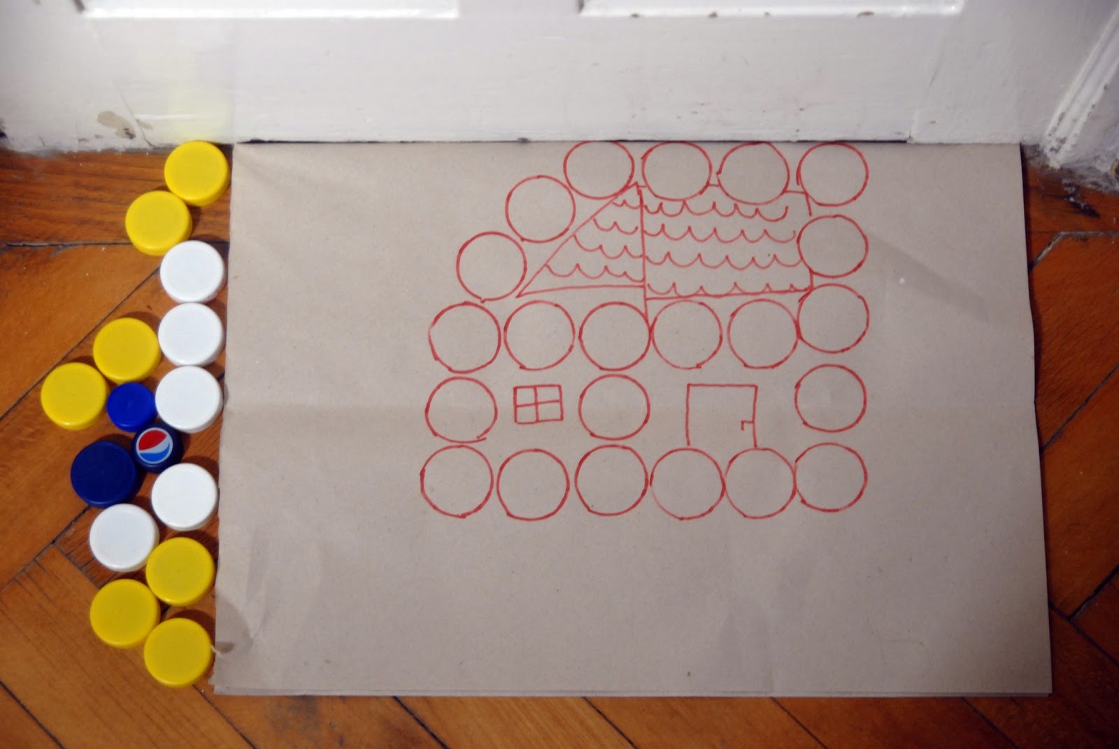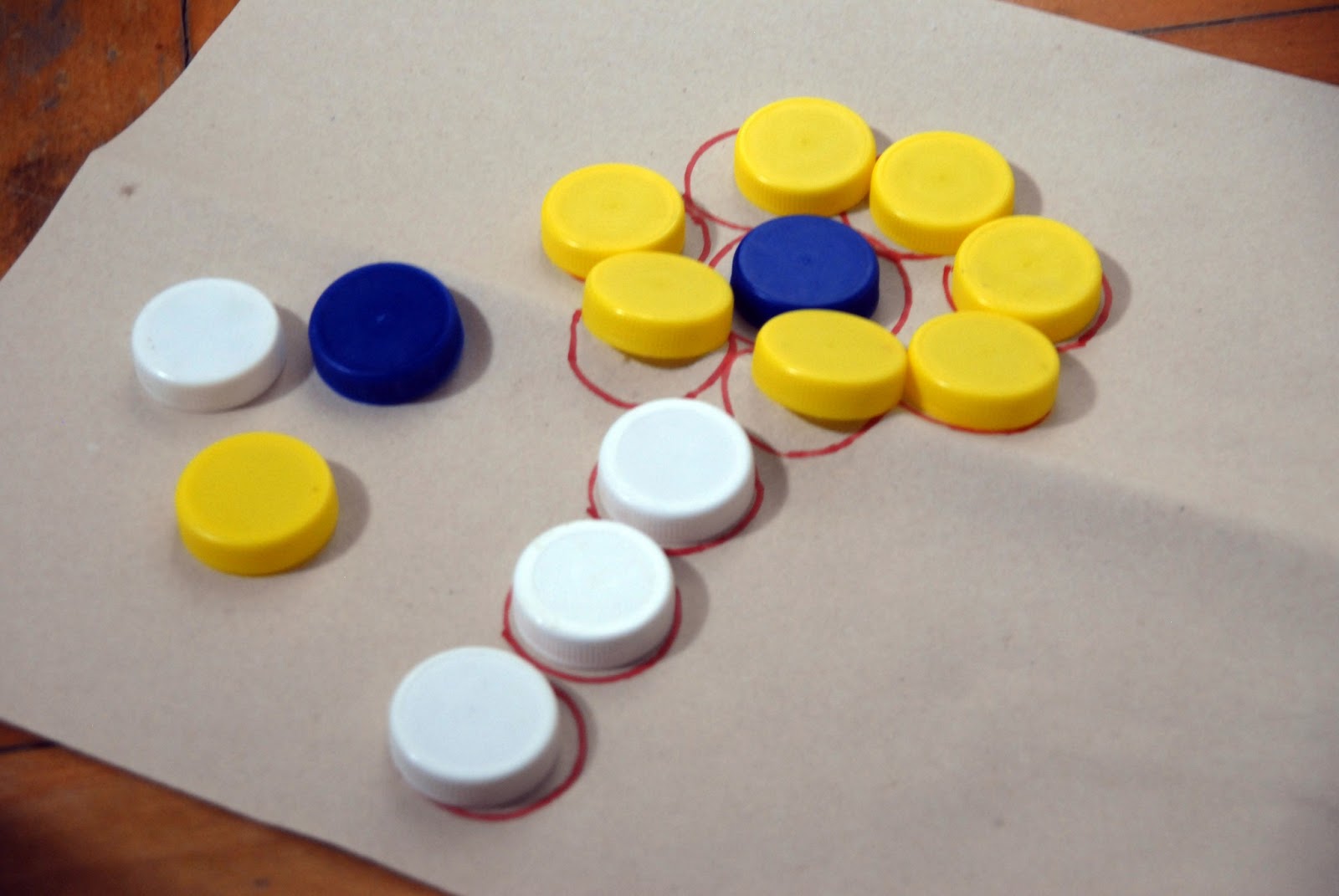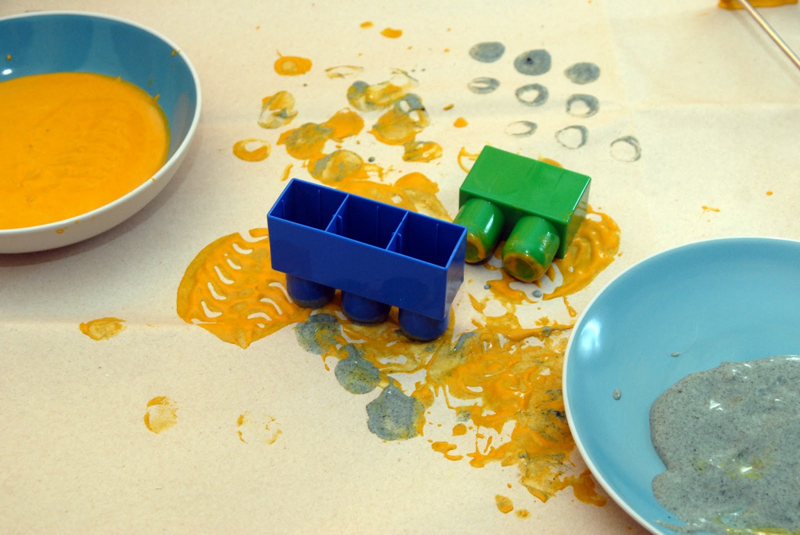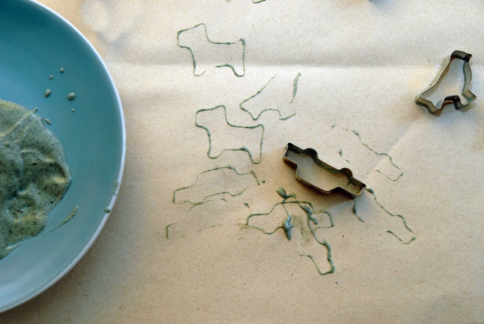 A kész formákkal máris lehet nyomdázni (érdemes nyelet ragasztani a hátoldalukra, lehetőleg olyat, ami befedi az egész formát, pl. befőttesüveg kupakja, ahogy a korábbi, pólónyomdás posztban is arra kerültek).