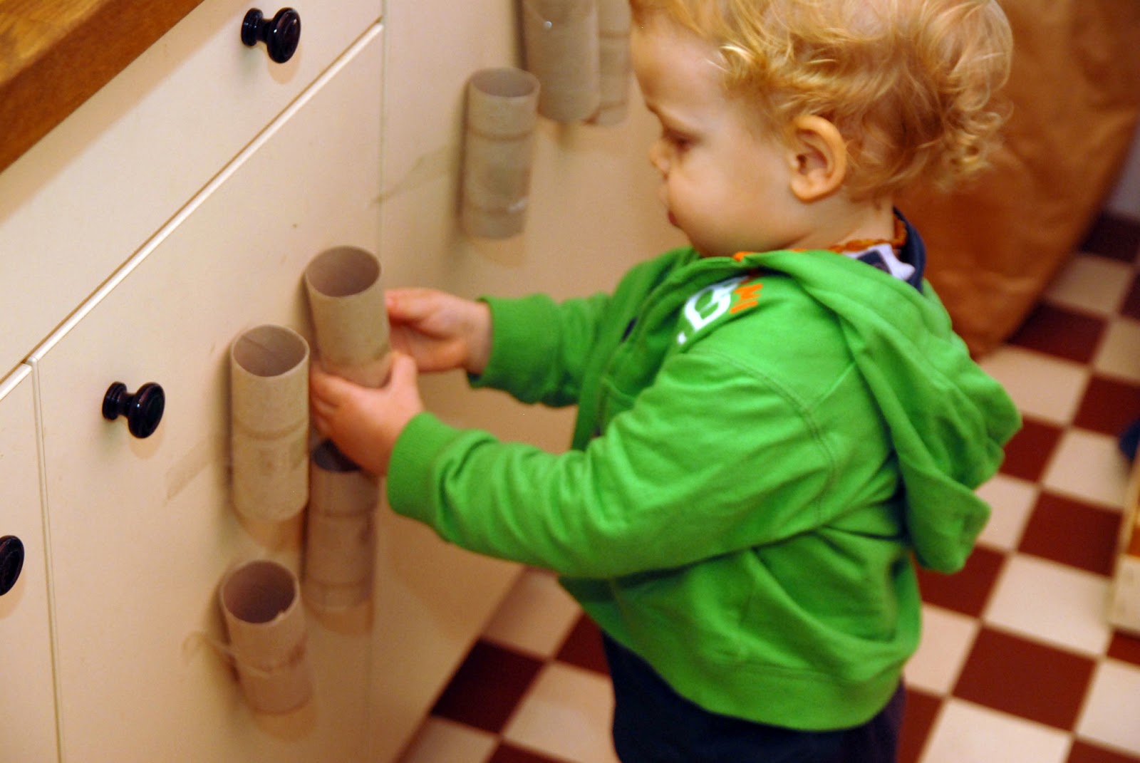 Konyhai bedobálósTökéletes időnyerő főzéshez vagy mosogatáshoz. A WC-papír gurigákat (vagy bármilyen más gurigákat) celluxszal felragasztjuk a konyhaszekrény ajtajára, majd előrántunk néhány kupakot, kisebb kavicsot, bármit, ami belefér és a kezébe nyomjuk. A feladat a bedobálás. Amikor unalmassá válik a játék, külön öröm lehet (nálunk az volt) egyenként lefejteni a ragasztócsíkot, majd diadalmasan anyának adogatni a zsákmányt.