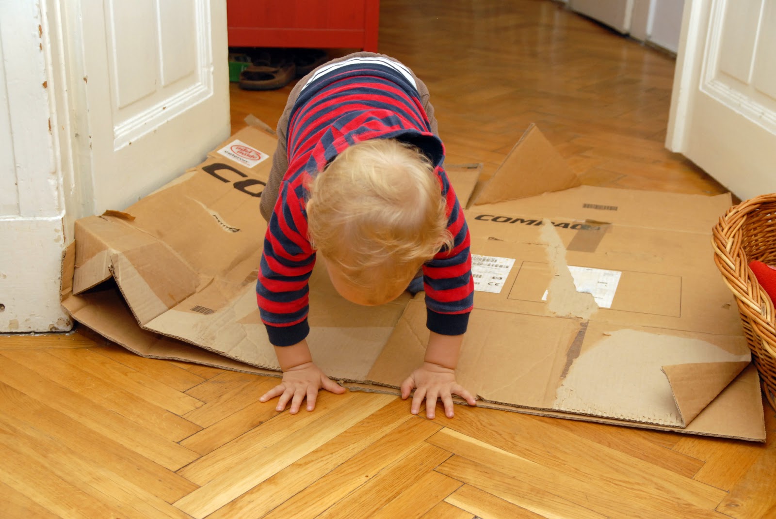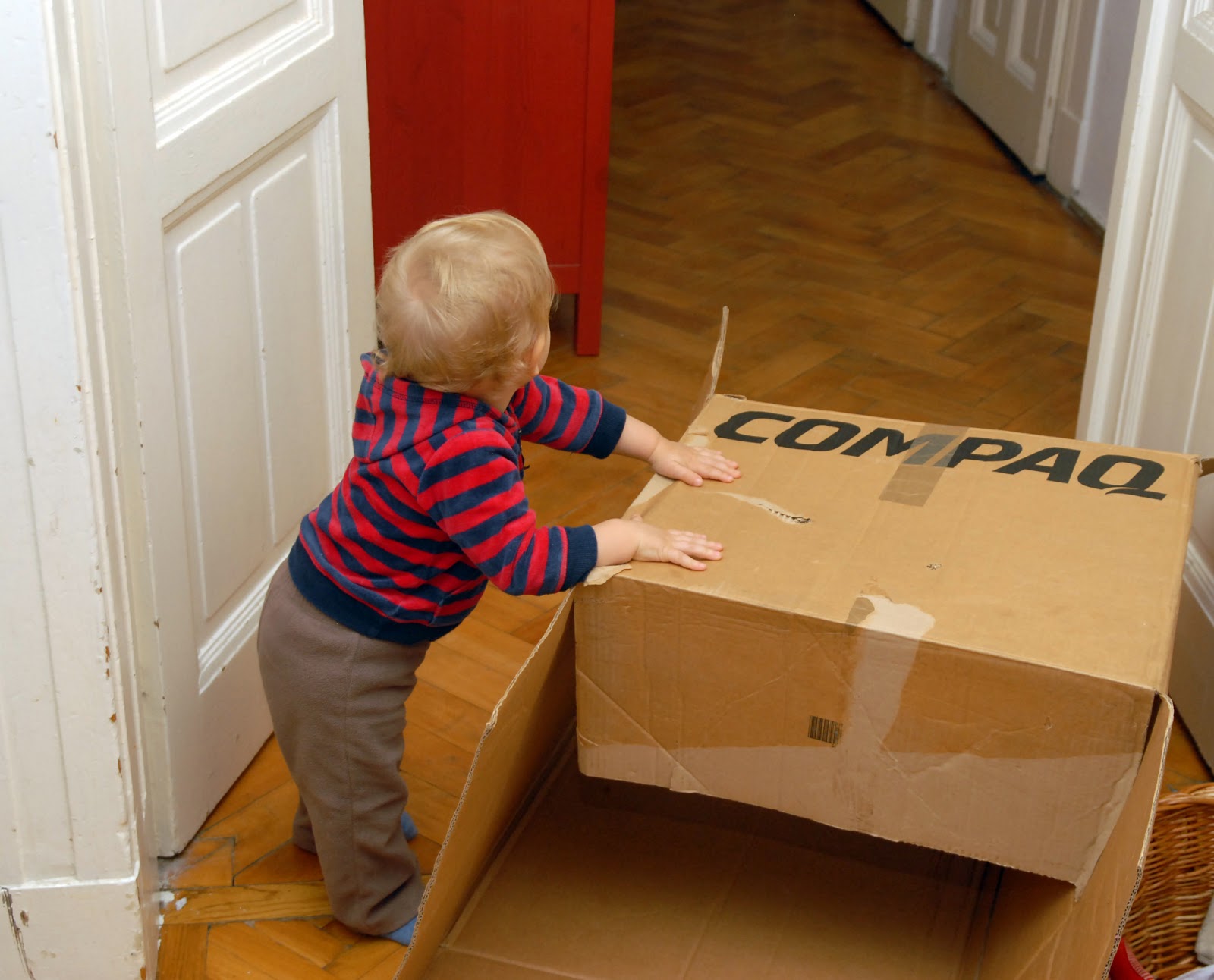 A kartondoboz projektEhhez a mókához nincs szükség másra csak egy nagy méretű kartondobozra, egy régi monitor doboza éppen megteszi. A gondosan elrejtett és néha-néha előkapott doboz csodálatos félórákat ad a szülőknek. Ilyenkor lehet szusszanni, mosogatni, ebédet odatenni vagy ami éppen adódik és egy "mindenlébenkanál" gyerkőc mellett nehezen megoldható. Bár az objektum leginkább alagútként használható, mi egy ajtót is vágtunk rá oldalra és néhány lyukat felülre.