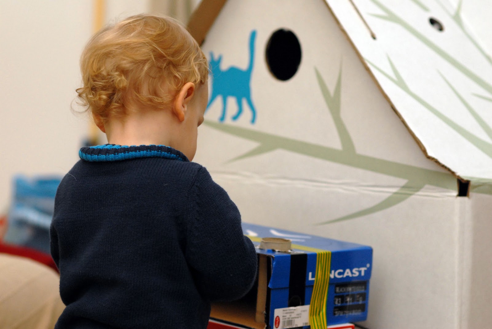 A legjobb benne, hogy három különböző méretű palackfejet ragasztott hozzá a nagypapa, megbonyolítva így a csavargatást, plusz leckét adva a logikának. Készült hozzá nyitható ajtó, amelynek kinyitásához egy kallantyút és egy riglit is ki kell nyitni. Alatta egyelőre csak egy rajzolt emberke található, de szeretném kibővíteni. Karácsonyra kaptunk