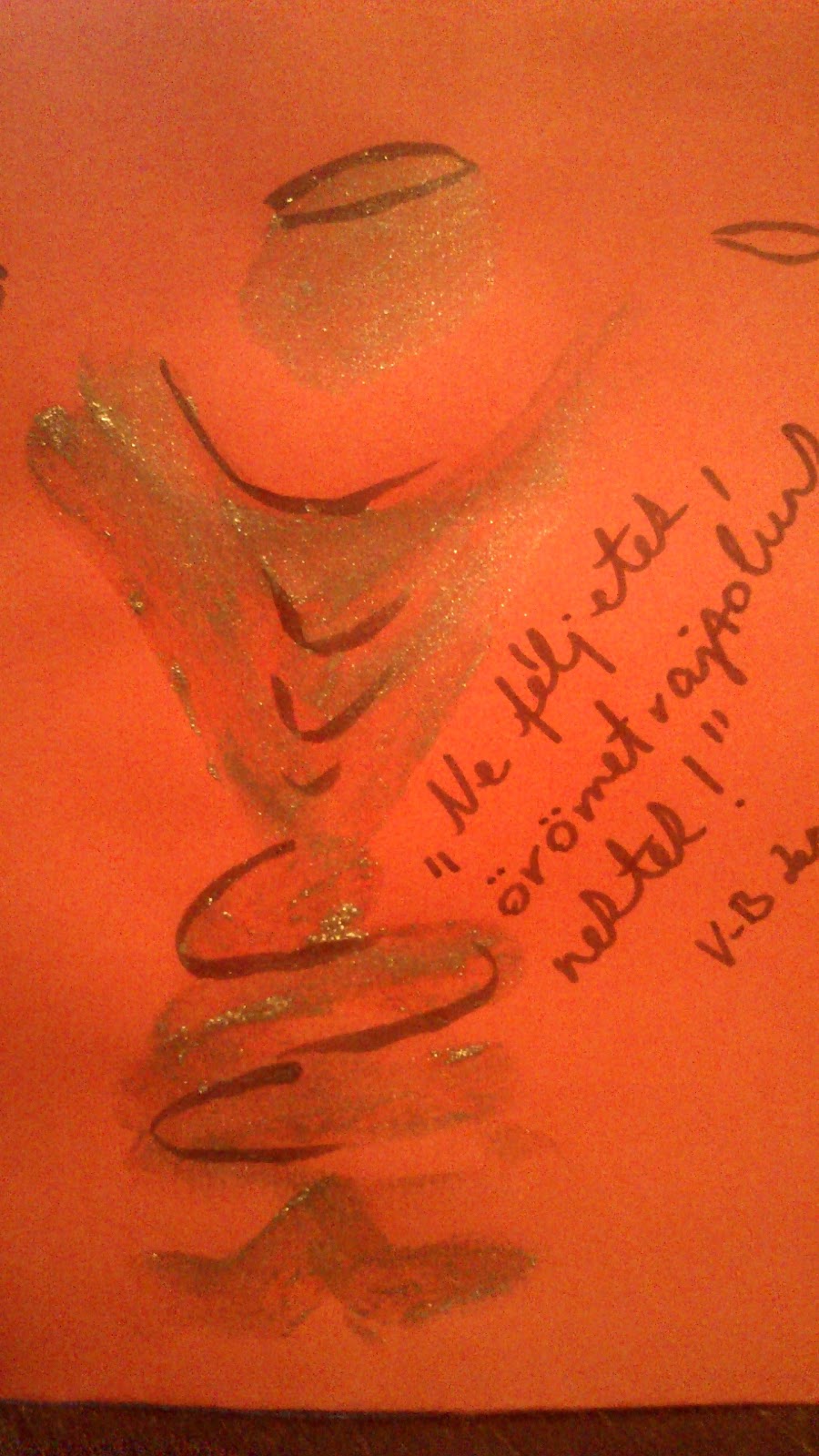 Kívül pedig jöhet a pacsmagolás. Arra kérjük a gyermeket, hogy rajzoljon angyalt ujjal. Lényeg, hogy feje meg szárnya nagyjából legyen. Az arany pigment (Hobby boltokban, művészellátókban kapható) a piroson jól mutat, nagyon nem lehet elrontani. A kész angyalpacnikat én fekete kontúrfilccel még angyalosabbá (felismerhetőbbé) tettem. Végül kislányom poétikus hajlamának köszönhetően felirat is akad: „Ne féljetek, örömet rajzolok nektek”.