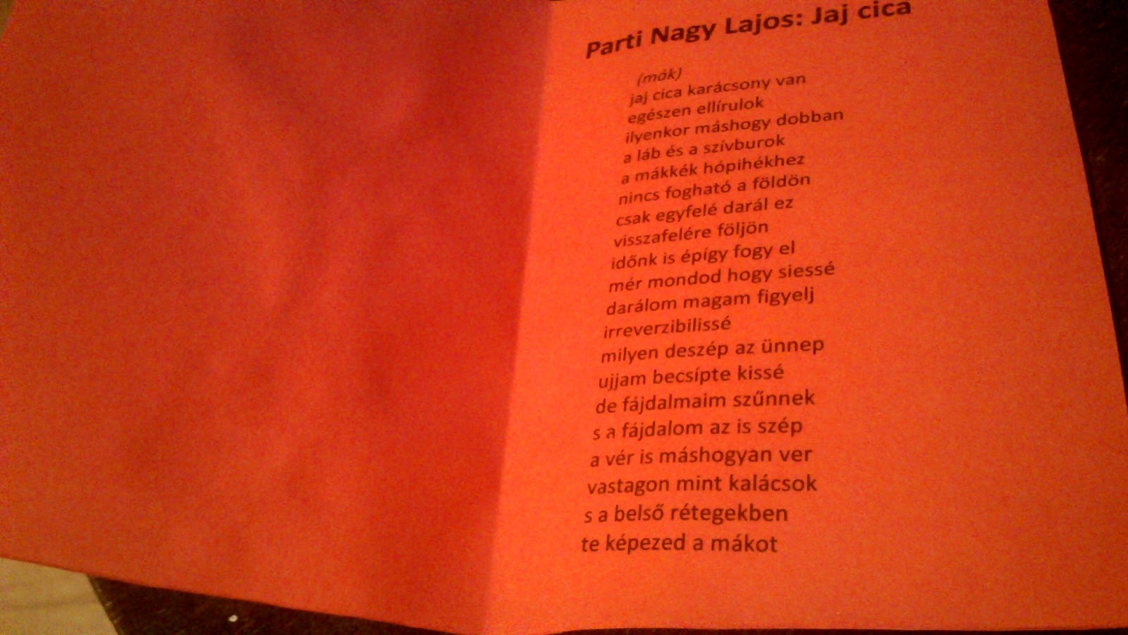Szóval veszünk egy piros A/4-es lapot, és rányomtatjuk megfelelő beállításokkal két példányban Parti Nagy Lajos überlehetetlenjének (Jaj, cica) valamely részét. Félbevágjuk a papírt, majd kettéhajtjuk, vers belül: