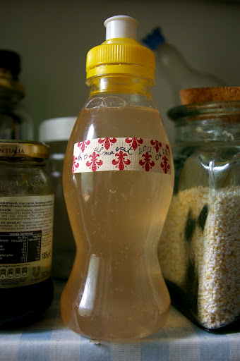 Kisfiam még nincs egyéves, egyelőre biokaján éldegél, minden egyes nap megeszik egy hol szép, hol nem túl szép almát, egyelőre a héja nélkül. Nem szeretem, ha ennivalót kell kidobni, így a szép kis héjdarabokat megeszem vagy kenegetem a belsejével az arcom, hogy mégse csak úgy vándoroljanak a komposztba, de egy idő után nem hagyott nyugodni a dolog, nem létezik, hogy ne lehetne felhasználni valahogy. Így jött az almaecet receptje, ebbe csak víz, cukor és almahéj kell. Fontos, hogy vegyszermentes legyen, mert napokig ázik, akkor aztán minden lazán kioldódhat.