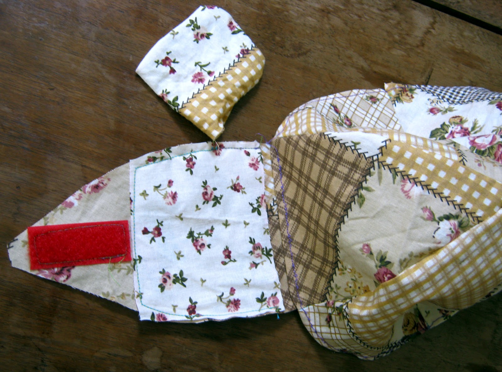 Varrd egymással szembeni cikkelyekhez a két maradék cikkelyt, majd varrd rá a zsebet és a tépőzárat. (Ezen a ponton legkésőbb érdemes próbálni, hogy pont a fül fölé kerüljenek a zsebek.)